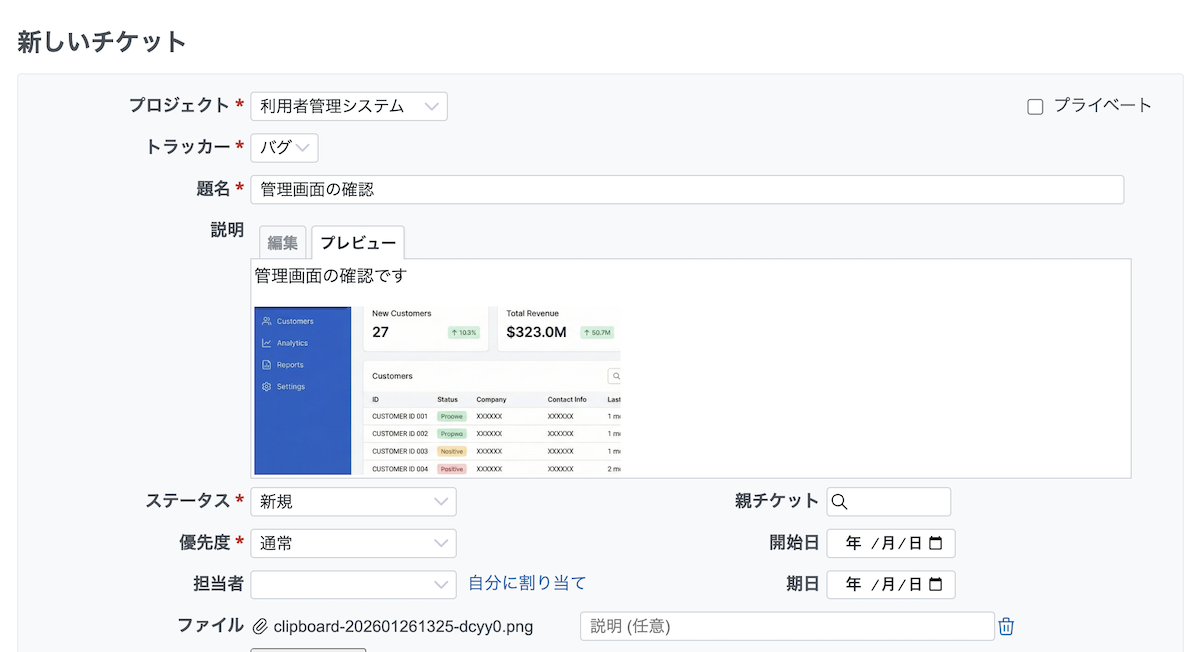 チケットの説明欄に画像を埋め込みをプレビューで確認