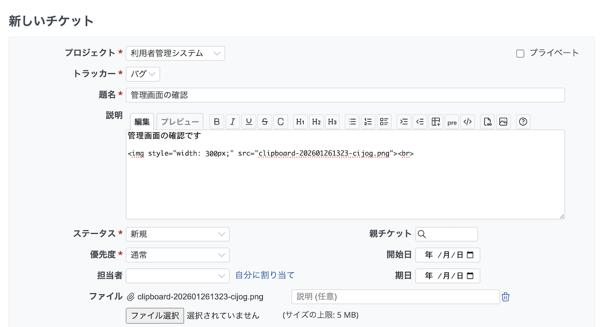 最も速く、簡単な機能がショートカットキーを使ったペーストです。 PCでスクリーンショットを撮影し、そのままRedmineの入力画面に貼り付けることができます。
