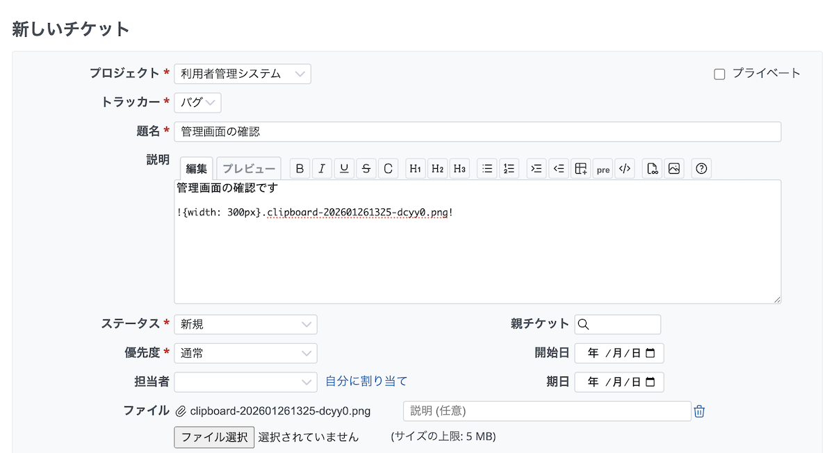 この画像の埋め込みは、チケットの説明欄やコメント欄だけでなく、Wikiやニュースでも利用できます。
