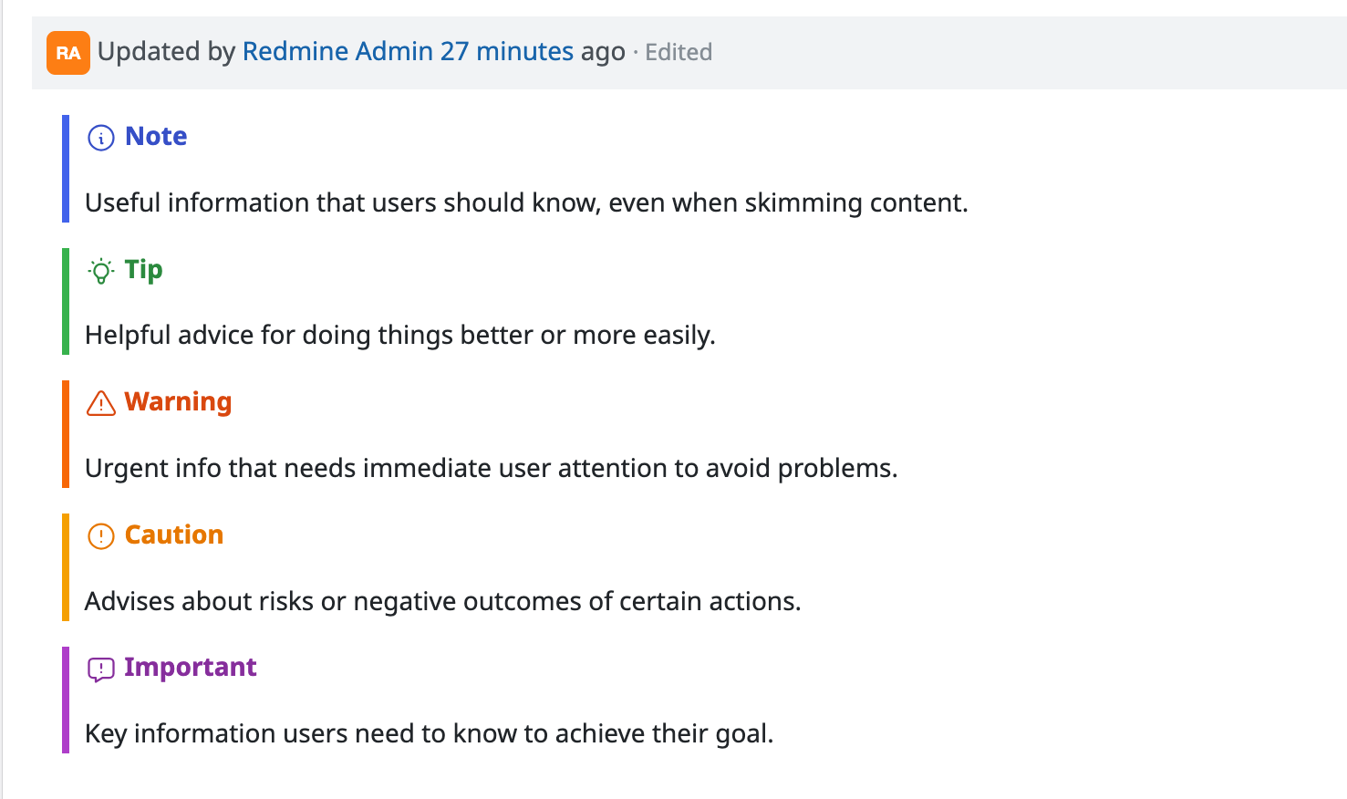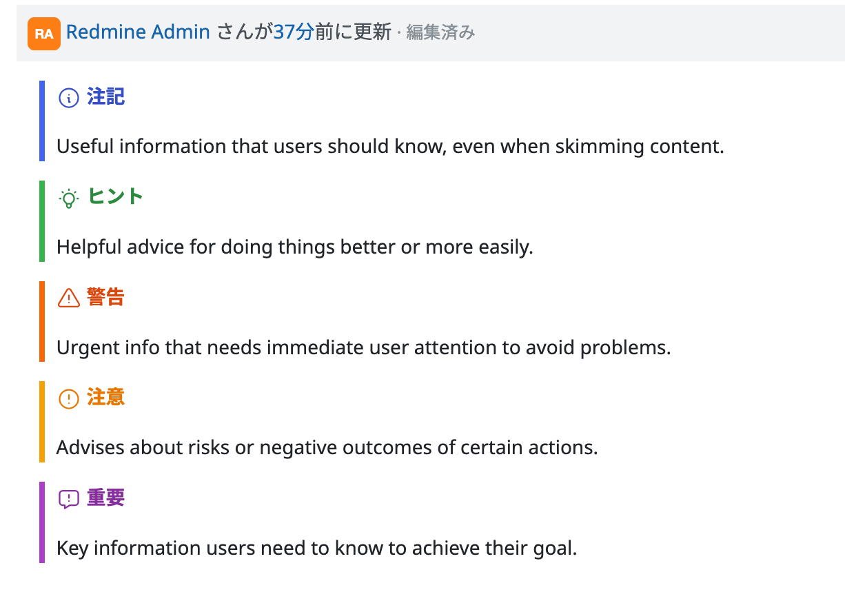 Redmine 6.1 以降、テキスト書式を「CommomMark Markdown」に設定している場合、アラート表示ができます 。