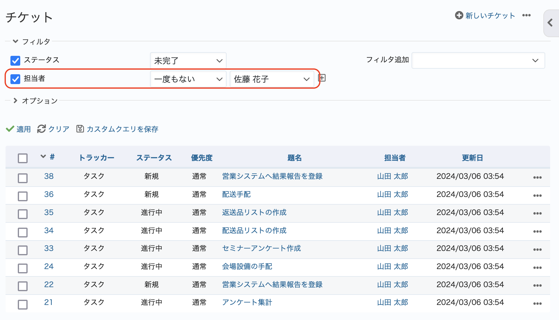 例えば、「担当者」フィルタで「一度もない」演算子を利用すると、担当者に一度もなったことがないチケットを抽出できます。