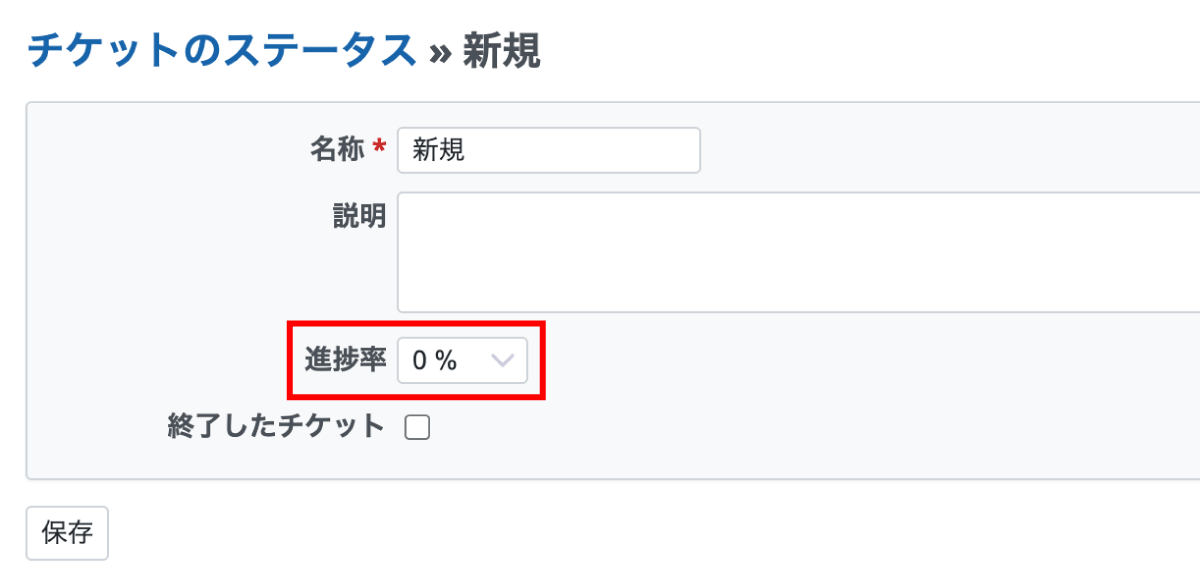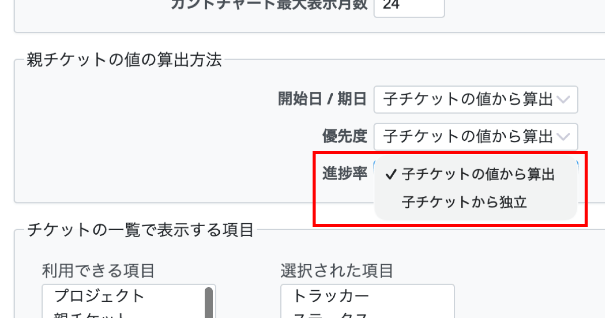 - 「管理」→「チケットのステータス」で親チケットのステータスに進捗率が未設定: 子チケットの加重平均